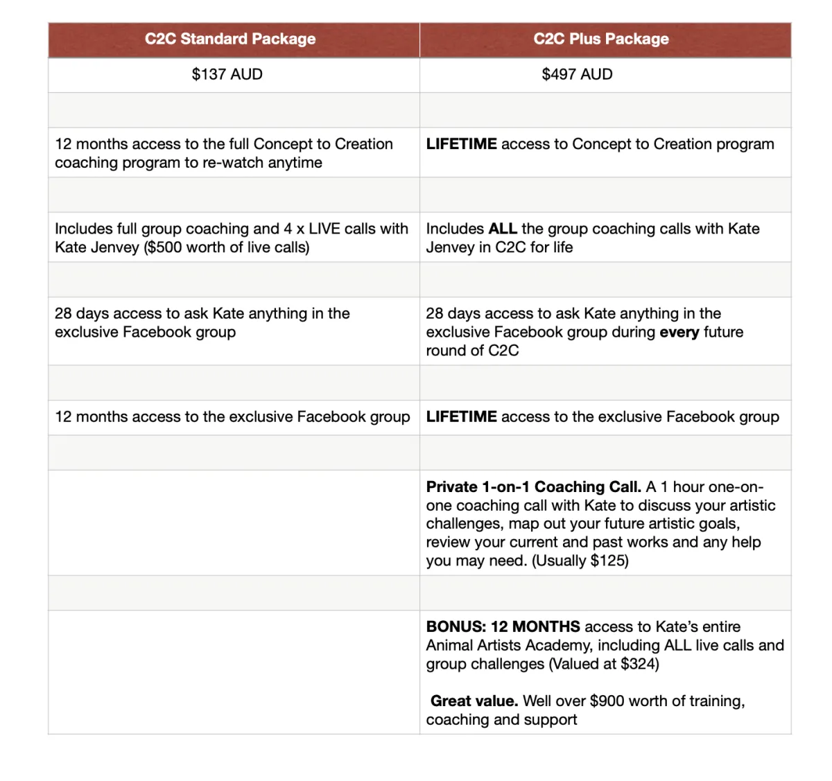 Concept to Creation is AUD $137 for the Standard package and AUD $497 for the Plus package.