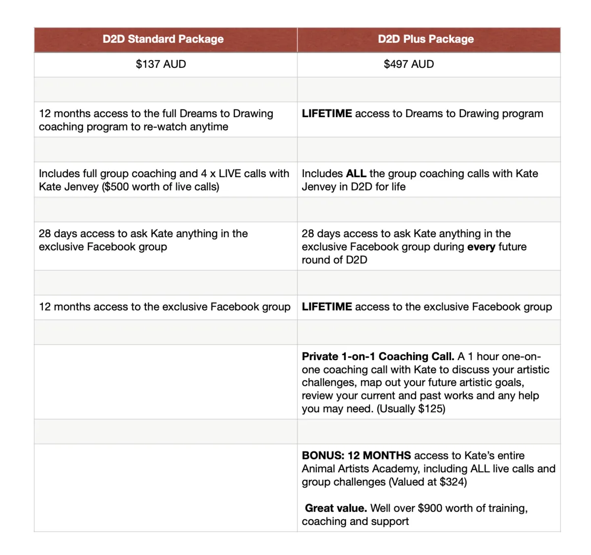 Dreams to Drawing is AUD $127 for the Standard package and AUD $497 for the Plus package.